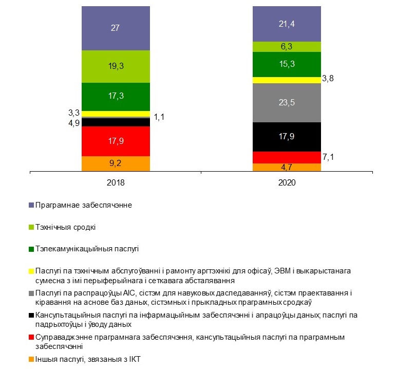 Структура адгружанай прадукцыі (работ, паслуг) арганізацый сектара ІКТ